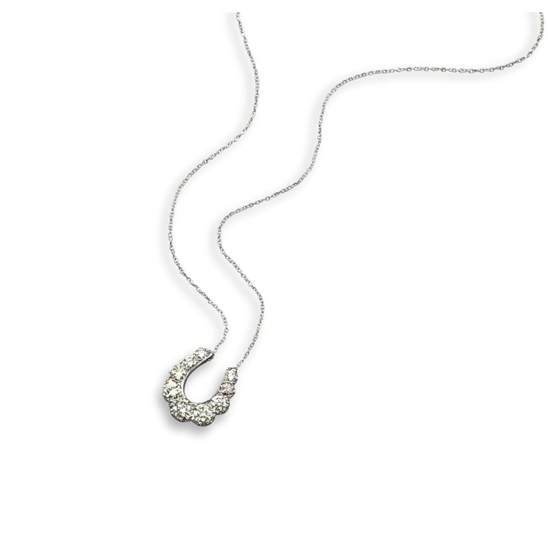 A diamond-set horseshoe pendant, set with nine graduated circular-cut diamonds in white gold. On fine-link white gold neck chain.