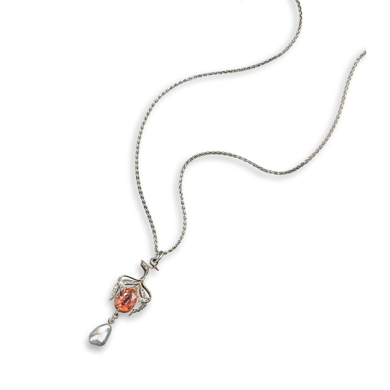 A pink tourmaline and diamond pendant, the pear-shaped pink tourmaline is set within scrolling borders set with single-cut diamonds and suspending a pearl in platinum and gold. On a fine-link platinum neck chain. The chain 40cm long. The pendant 4.6cm long.