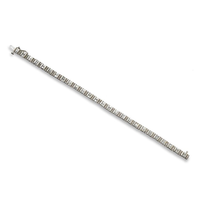 A diamond line bracelet, alternately-set with clusters of baguette-shaped and circular-cut diamonds in white gold. Stamped 14k. 19.5cm long.