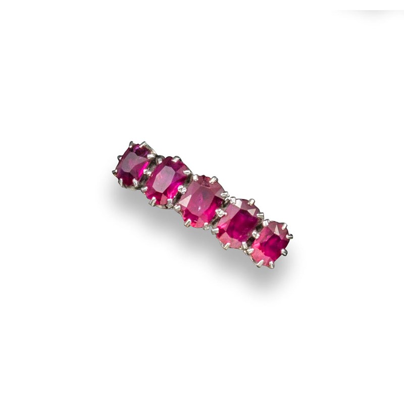 A ruby five stone ring, the five oval-shaped rubies are set in white gold. Size N 1/2.