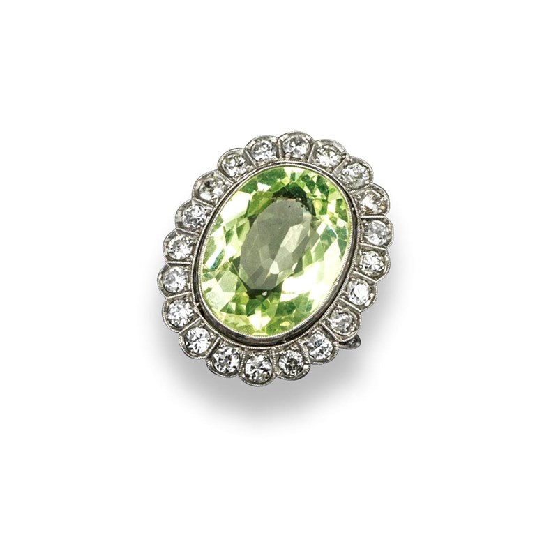 A diamond and synthetic green stone cluster ring, the oval-shaped green stone is set within a surround of twenty circular-cut diamonds in white gold and platinum. Size P.