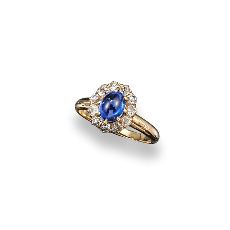 A sapphire and diamond set cluster ring, the oval-shaped sapphire cabochon is set within a surround of cushion-shaped diamonds in gold.