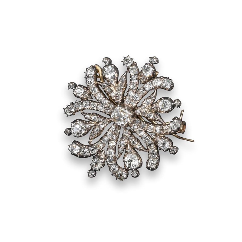 A late George III diamond set stylised cruciform brooch pendant, centred with a cushion-shape diamond with smaller diamonds set to the bifurcated terminals and each divided with a foliate design. Set in silver and gold. Cased.