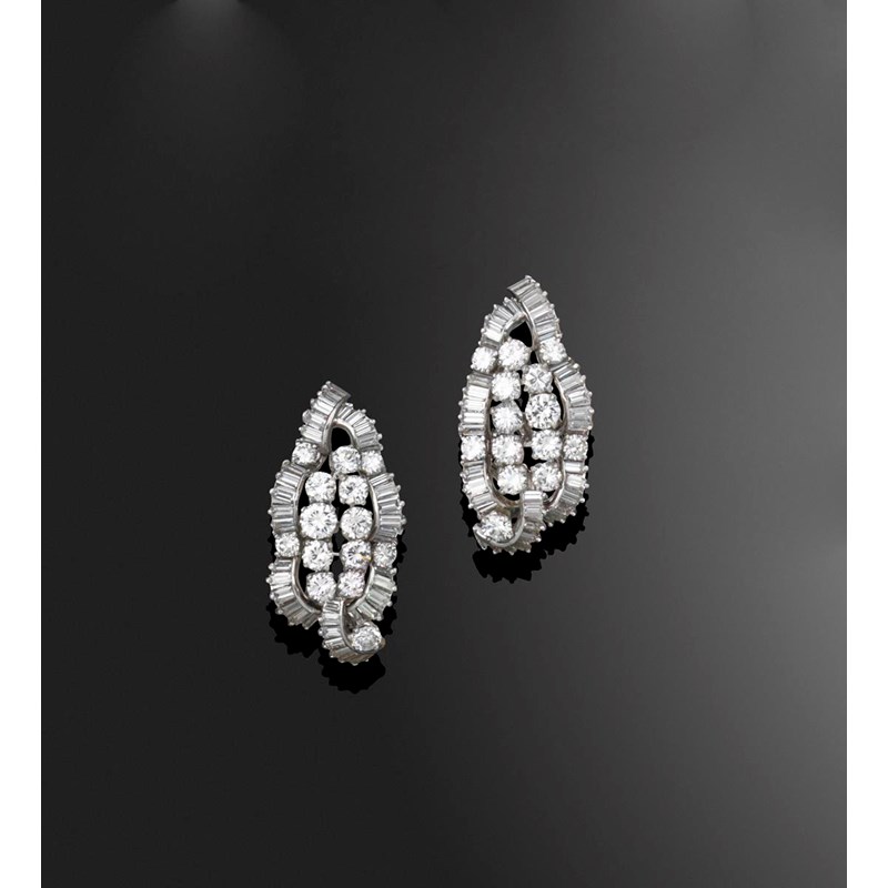A pair of diamond earrings by Boucheron, of stylised leaf form and set with fourteen round brilliant cut diamonds within a border of baguette shaped diamonds in platinum. Signed to the reverse Boucheron London.