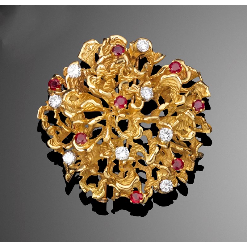 A stylised gold flower head brooch, set with circular cut rubies and diamonds. Signed to the reverse Boucheron Made in France. 5cm wide.