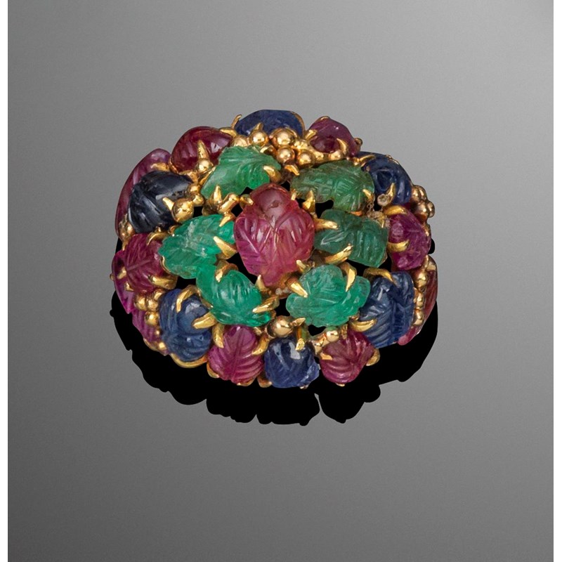 A gold bombe ring mounted with foliate carved emeralds rubies and sapphires, the Tutti Frutti ring with heavily fluted shank. Size I.