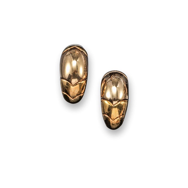 A pair of gold earrings by Bulgari, of bombe-form, set in two colour gold. Stamped 750 and signed Bulgari. In Bulgari box and outer case.
