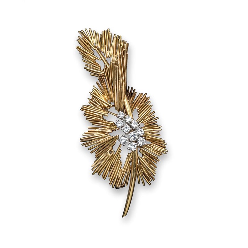 A diamond set gold brooch by Boucheron, the stylised leaf set with ten round-cut brilliant diamonds. 6.5cm high signed Boucheron Paris, numbered 15137 and with maker's mark RM in a lozenge. 6.5cm long.