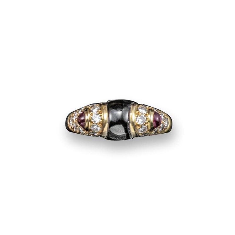 A diamond, onyx and ruby ring by Marina B (Bulgari), centred with a black onyx section and the shoulders pavé-set with small round brilliant-cut diamonds and two cabochon rubies. Signed with intials. Size N.