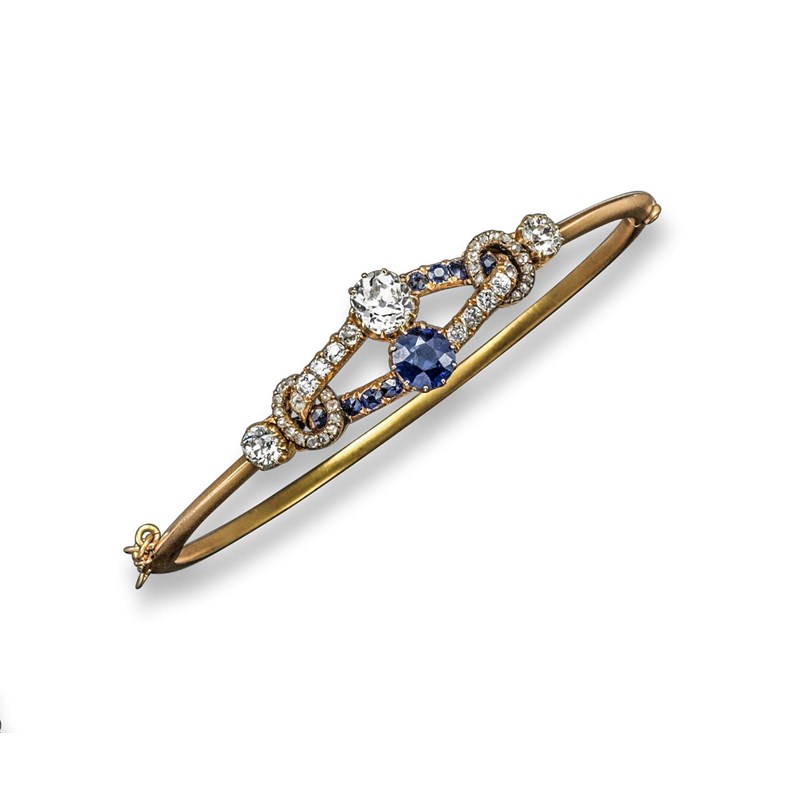 A sapphire and diamond set hinged bangle, set with a larger cushion-shaped diamond and larger oval-shaped sapphire and further smaller sapphires and diamonds in gold. Obscure control mark but possibly Russian. With bloomed gilding.