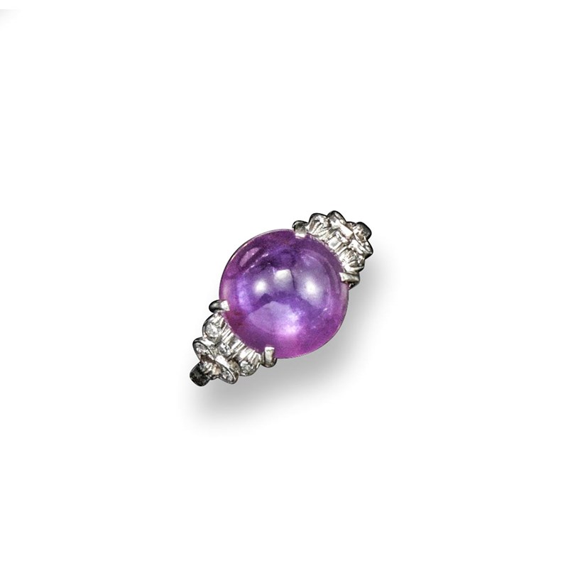 A star sapphire and diamond set ring, the circular cabochon star sapphire is set with five small circular-cut diamonds to each pierced shoulder in platinum. Size L 1/2.