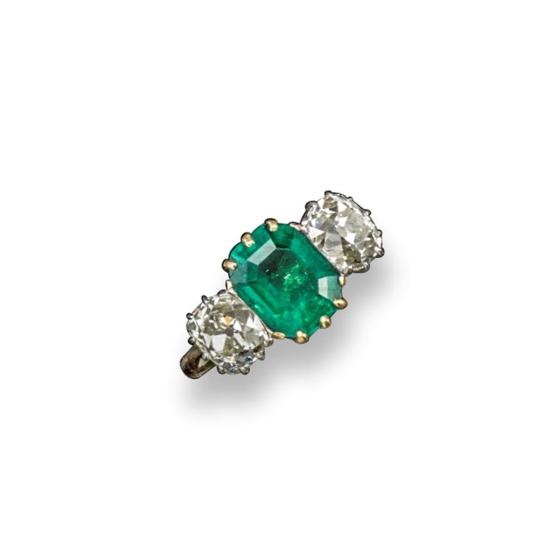 An emerald and diamond set three stone ring, the octagonal-cut emerald is set with two cushion-shaped diamonds in gold. Size O.