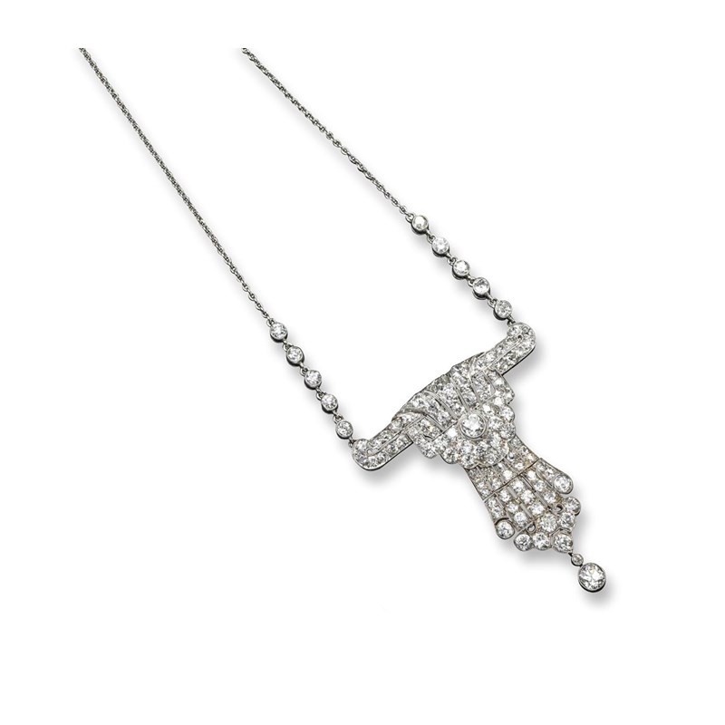 An Art Deco abstract diamond pendant, the symmetrical design is millegrain-set overall with graduated circular-cut diamonds with two articulated diamonds suspended, in platinum On a fine-link chain set with five circular-cut diamonds to each side.