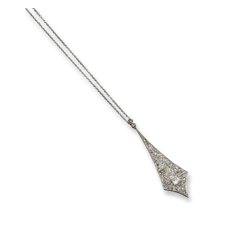 An early twentieth century diamond set articulated pendant, set with graduated cushion-shaped and rose-cut diamonds to the geometric pierced platinum mount. And a fine-link platinum neck chain. The pendant 5.5cm high.