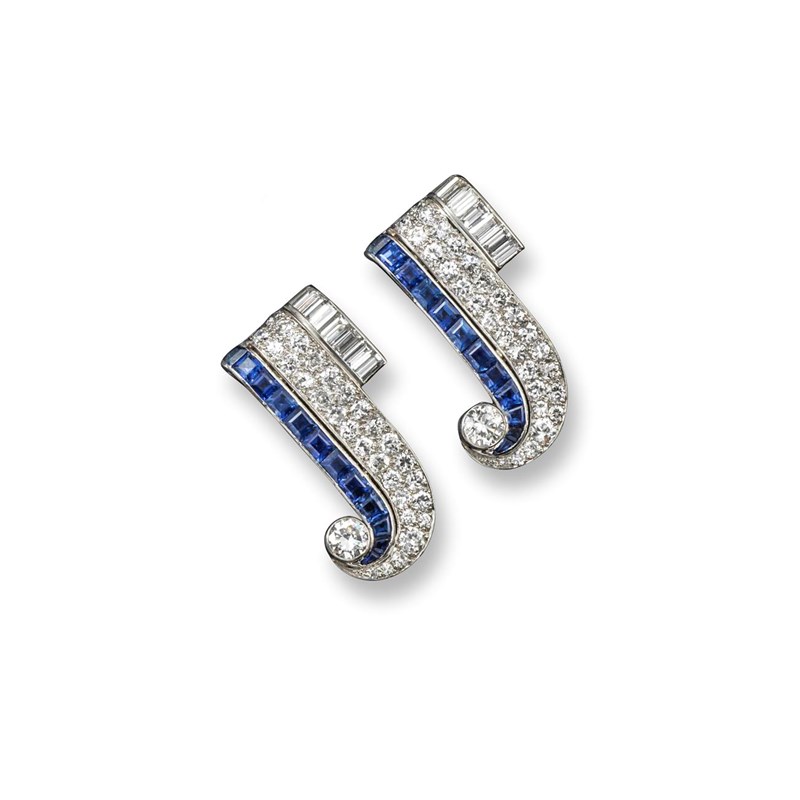 A pair of Art Deco vertical scroll brooches, set with a line of calibre-cut sapphires terminating in a larger old circular-cut diamond, two lines of smaller circular-cut diamonds and a section of baguette-shaped diamonds in platinum. The mid section of diamonds with honeycomb back setting and four additional smaller hooks to the hinged pair of principal pins. Circa 1935. 3.5cm high.