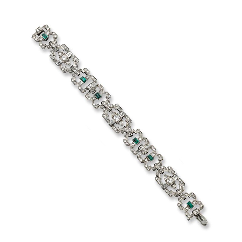 An emerald and diamond bracelet, of carved and pierced geometric design and millegrain-set with graduated circular-cut diamonds, baguette-shaped diamonds and emerald-cut emeralds in platinum. 18.2cm long.