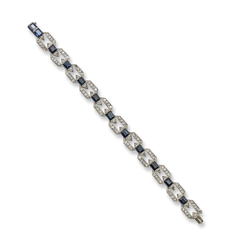 A French Art Deco sapphire and diamond bracelet, the octagonal links are millegrain-set with circular-cut diamond, each link set within emerald-cut sapphires in platinum and white gold. 17cm long.