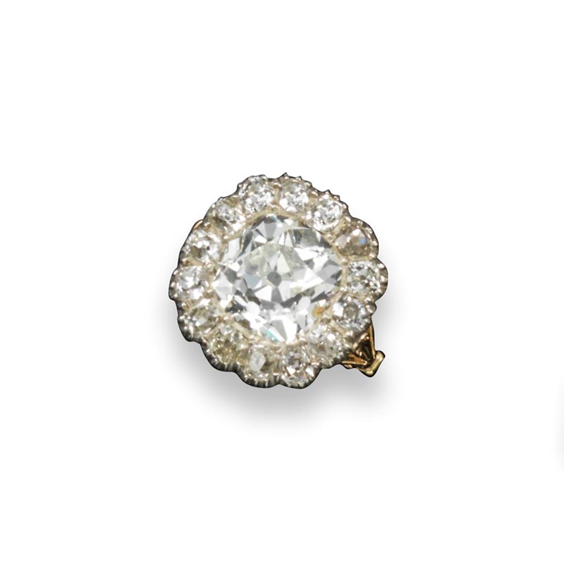 A diamond cluster ring, the centre cushion-shaped diamond weighs approximately 5.00cts and is set in a surround of fourteen smaller cushion-shaped diamonds in silver and gold. Pierced shank with stylised fleur-de-lys shoulders. Size J. (Including sizing sleeve to the inner shank).