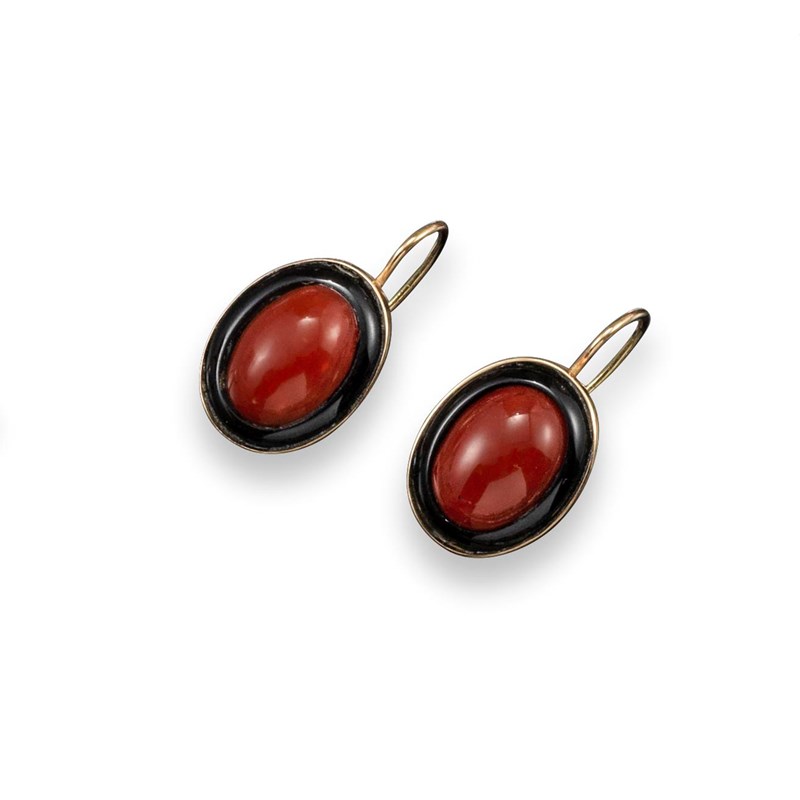 A pair of Art Deco coral and black onyx earrings, each centred with an oval section of deep red coral within a black onyx surround and mounted with gold. 1.5cm high.