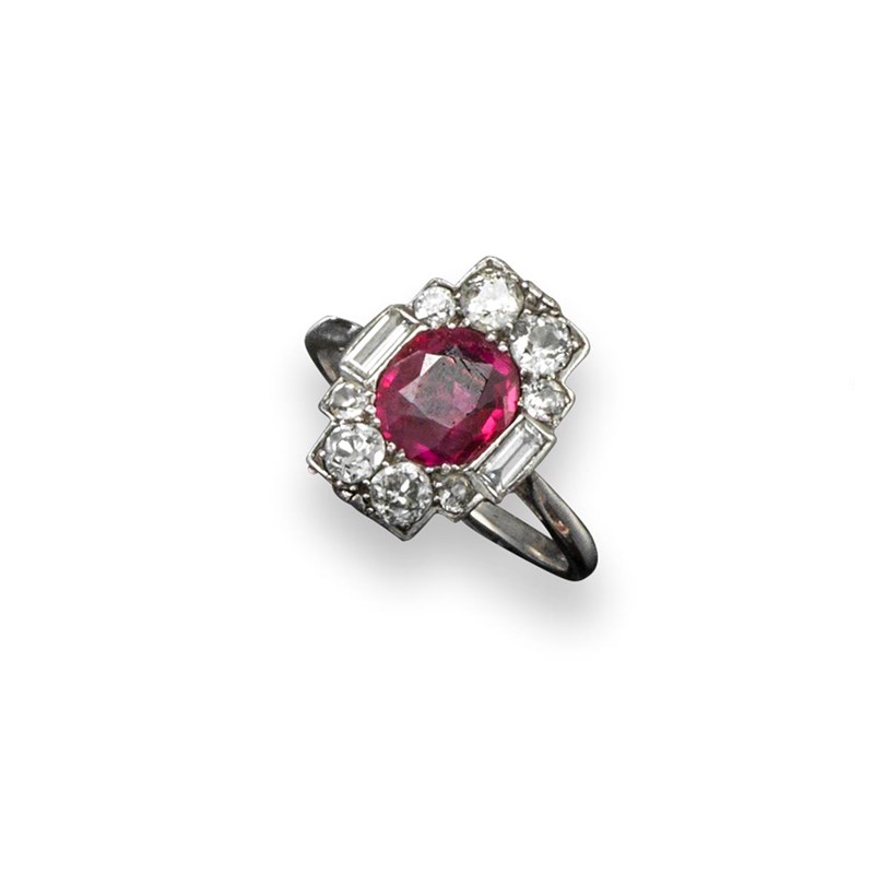 An Art Deco ruby and diamond cluster ring, the oval shaped ruby is set with two baguette-shaped shoulder diamonds and eight graduated old circular-cut diamonds in platinum. Size M 1/2