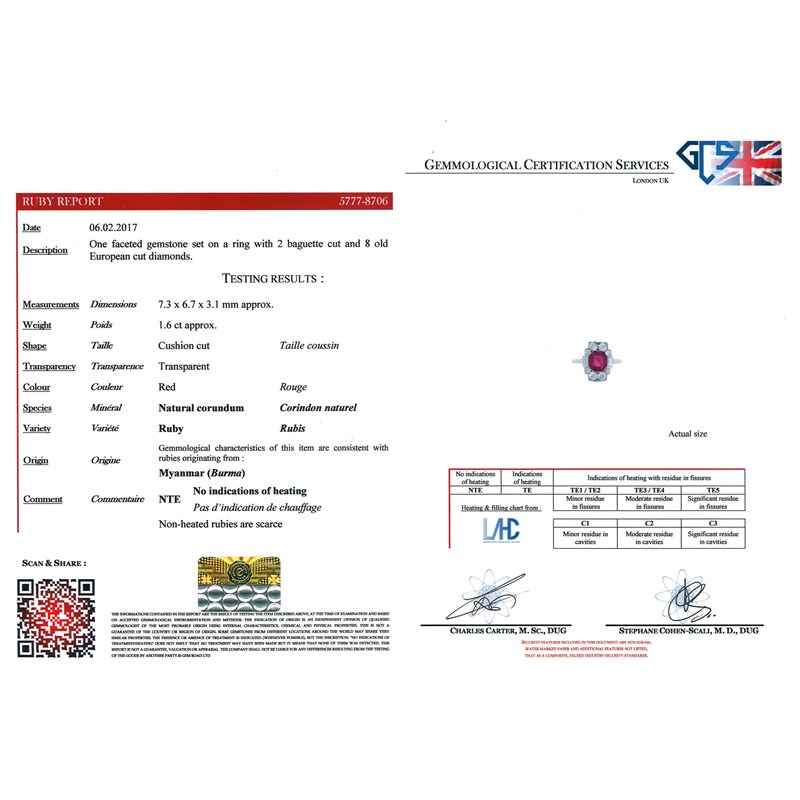 Accompanied by report number 5777-8706 dated 6th February 2017 stating that the cushion-shaped ruby weighs approximately 1.60cts and is a natural ruby with no evidence of heating. Origin: Burma.