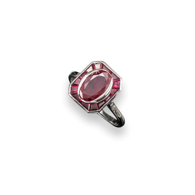 A ruby cluster ring, the oval-shaped ruby is set within a surround of tapered baguette-shaped rubies in platinum with two small diamonds to each shoulder. Size N.