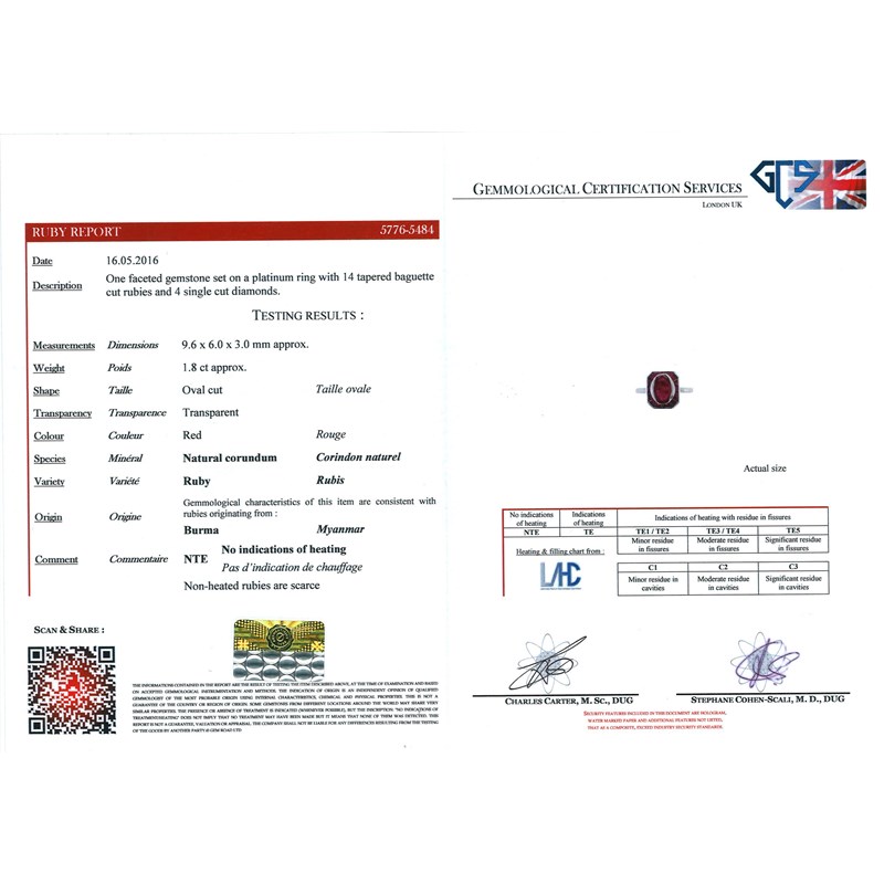 Accompanied by report number 5776-5484 dated 16th May 2016 from GCS, London stating that the oval-shaped ruby weighs approximately 1.80cts and is a natural ruby with no indications of heating. Origin: Burma.