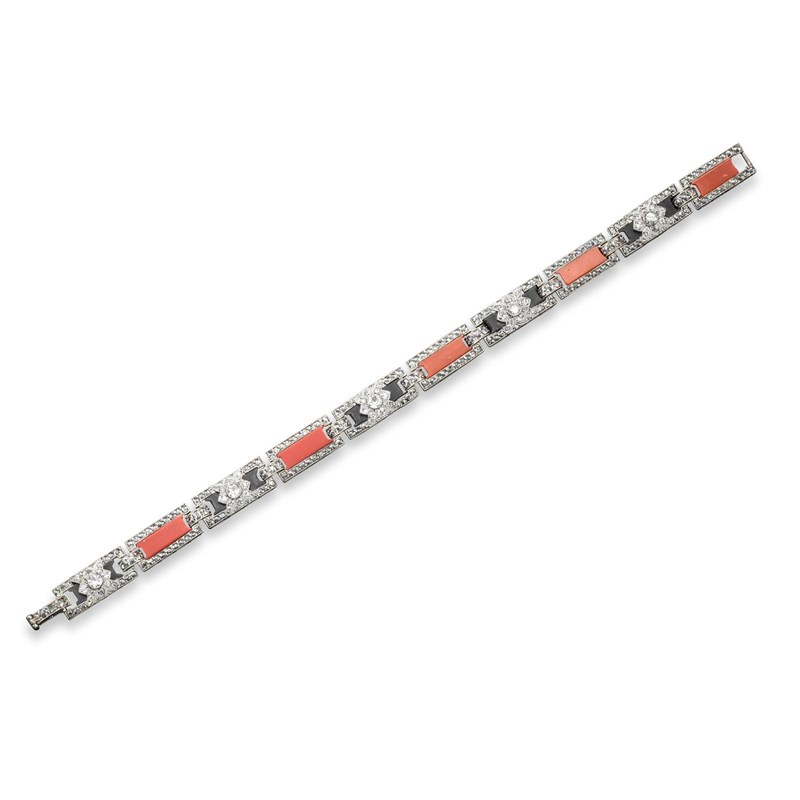 An Art Deco panel bracelet, each link is alternately centred with a coral or black onyx rectangular section, set within a surround of rose-cut diamonds and the onyx sections centred with a diamond set floral motif. Platinum. 18.5cm. Case.