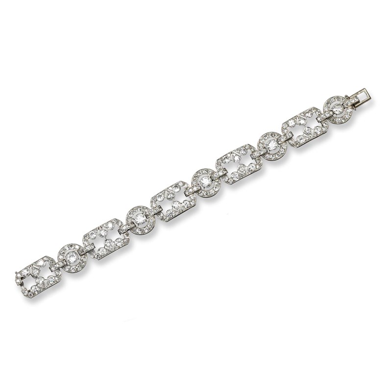 An Art Deco diamond set bracelet, mounted with five rectangular open work links, each millegrain-set with graduated old circular cut diamonds in platinum. Alternately mounted with circular links, each set with a larger circular cut diamond within a surround of smaller old circular cut diamonds. 17.5cm. Fitted case.