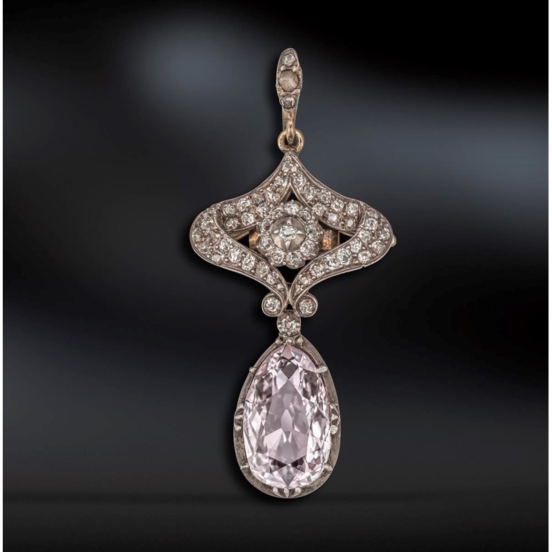 An Art Nouveau pink and white diamond pendant, the pear-shaped pink diamond weighs 2.77cts and suspends from a scroll mount set with graduated cushion-shaped diamonds. Fitted case by Paris of Liverpool.