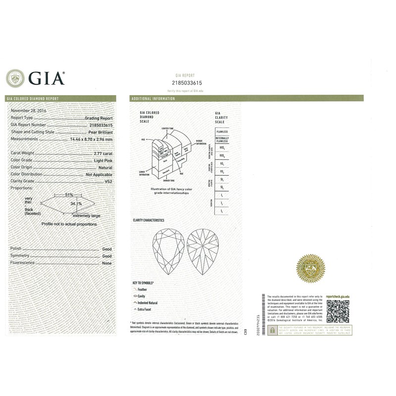 Accompanied by report number 2185033615 dated 28th November 2016 from GIA, stating that the pear-shaped diamond measures 14.46 x 8.70 x 2.96mm and weighs 2.77cts. Light pink in colour with VS2 clarity. No fluorescence.