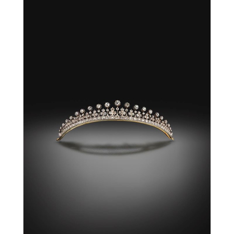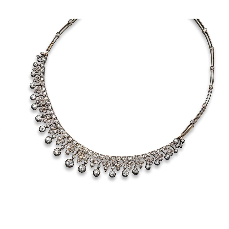 A late 19th century fringe necklace converting to a tiara, the line of thirty seven old cushion-shaped diamonds alternately suspend a trefoil of diamonds and a diamond drop, each with two graduated old circular-cut diamonds in silver and gold. On a detachable pierced knife-edge chain, each section set with a rose-cut diamond. With stamped inventory number 19926. In fitted case by Cartier. The box contains the original fitting so that the fringe section can we worn as a tiara.