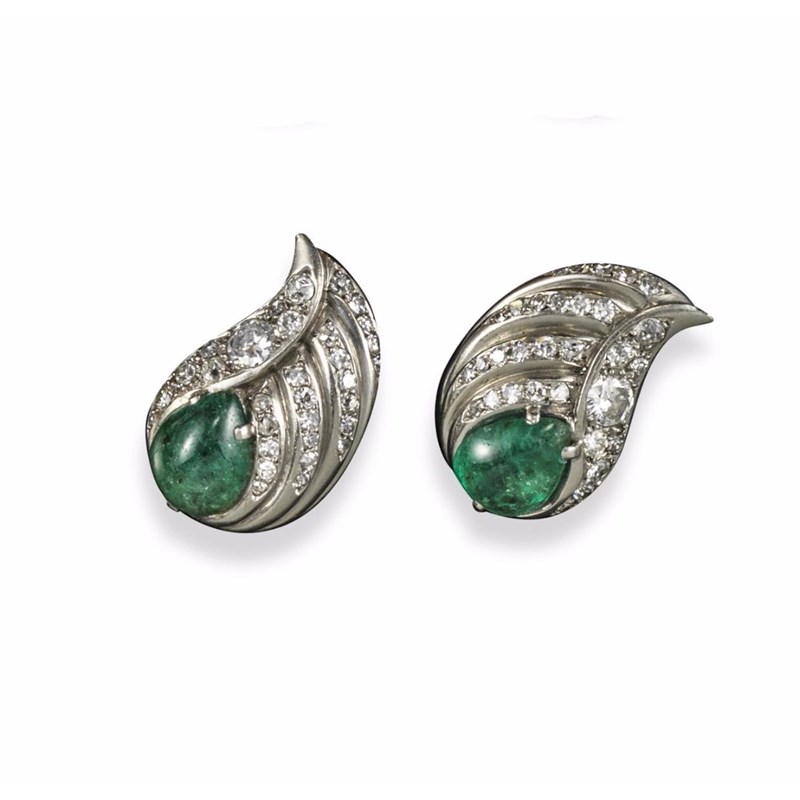 A pair of French emerald and diamond cluster earrings, of stylised leaf design and set with a pear-shaped Colombian emerald and lines of graduated circular-cut diamonds in white gold. French control marks and maker's lozenge for G.D. 2.5cm long.