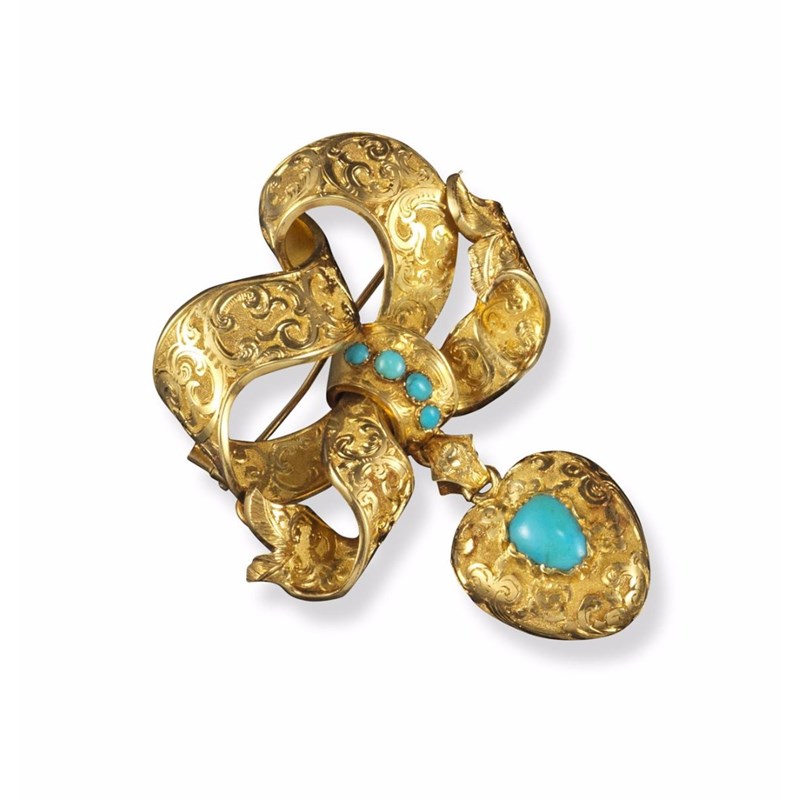 A Victorian turquoise mounted gold brooch, the stylised gold bow with scrolling foliate decoration suspends a gold heart-shaped locket pendant set with a turquoise cabochon. 5.5cm long. Fitted case by R&S. Garrard & Co.