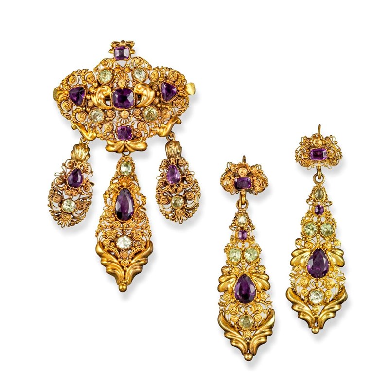 A 19th century gold cannetille suite, comprising a pair of drop earrings mounted with amethysts and chrysolites within cannetille and repousse border. With a matching brooch pendant suspending three drops, which can be converted to be worn as the clasp to a necklace. Fitted case.
