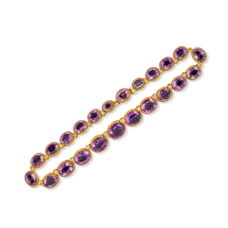 A late Victorian amethyst riviere necklace, the graduated oval-shaped amethysts are set in yellow gold coronet mounts with gold pellet border. Each separated with a stylised yellow gold leaf. 40cm.
