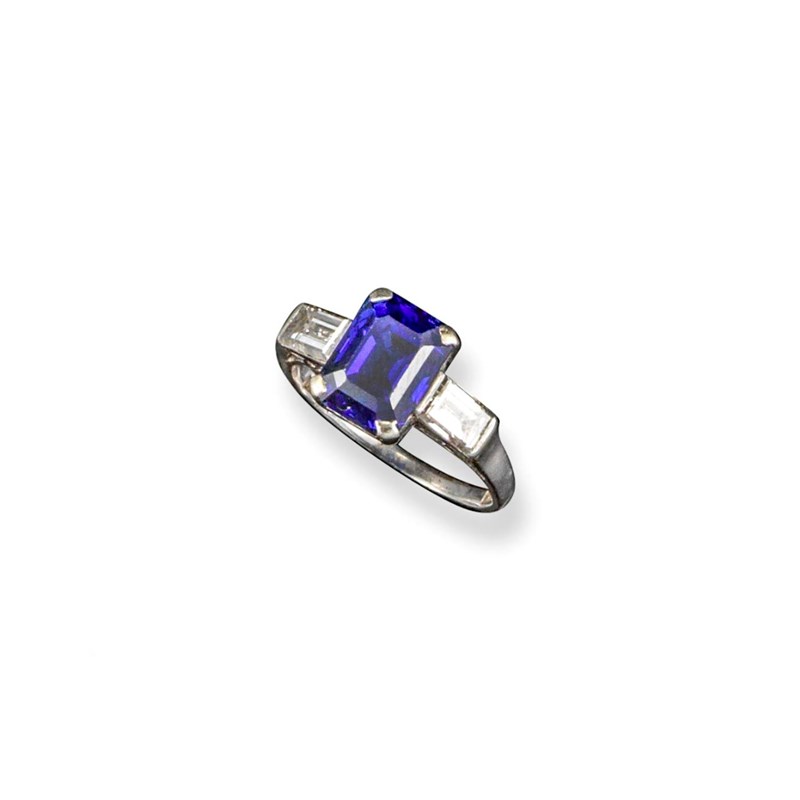 A sapphire and diamond cluster ring, the emerald-cut sapphire is set within two bagette-shaped diamonds in carved and pierced scroll mount. In platinum. Size M.