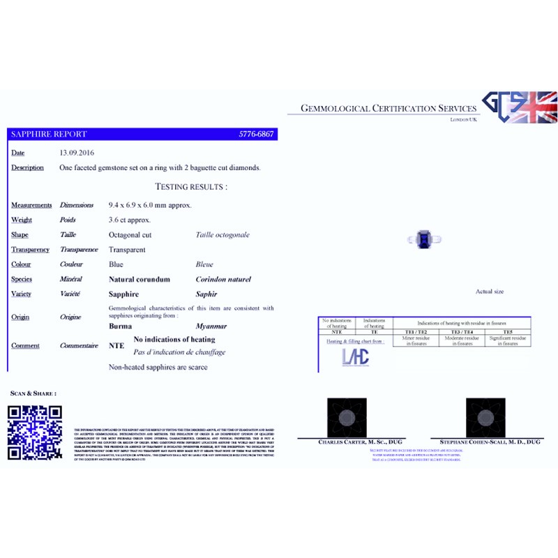 Accompanied by report number 5776-6867 dated 13th September 2016 from GCS, London stating that the octagonal cut sapphire weighs approximately 3.60cts and is a natural sapphire with no indications of heating. Origin: Burma.