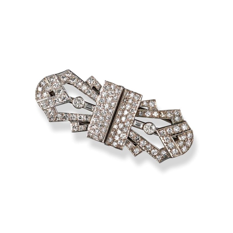 A diamond-set double clip brooch, of geometric design and set with single, circular-cut and baguette-shaped diamonds in platinum. Separating to be worn and two double clips. 5.2cm wide.