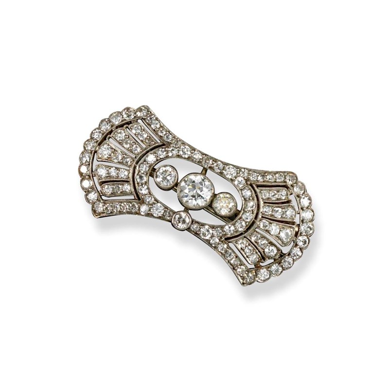 An Art Deco diamond brooch, of geometric design, millegrain-set with graduated circular-cut diamonds in platinum. 4.2cm wide.