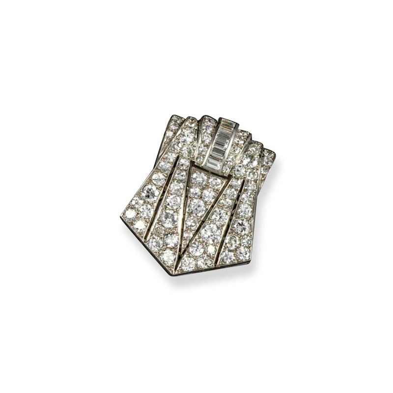 A French Art Deco diamond clip, of geometric form and pavé-set with circular and baguette-shaped diamonds in platinum. French control marks. 2.9cm long.