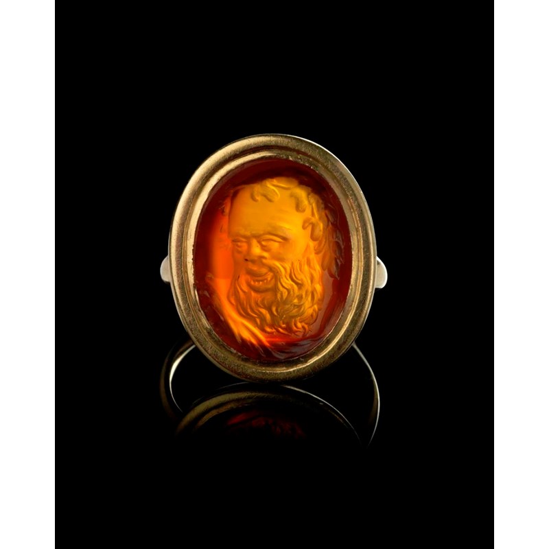 A deeply carved oval carnelian-mounted gold ring, the intaglio second half 18th century and depicting the head of Bacchus. Contemporary mount. Intaglio 1.8cm high, size G. Case.