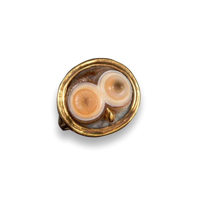 A carved oval double eye agate cameo-mounted gold ring, the Renaissance cameo, 16th century, depicting the head of an owl and applied with a gold beak. The cameo 1.6cm wide. The late 18th century mount with fluted shoulders. Size I. Case.
