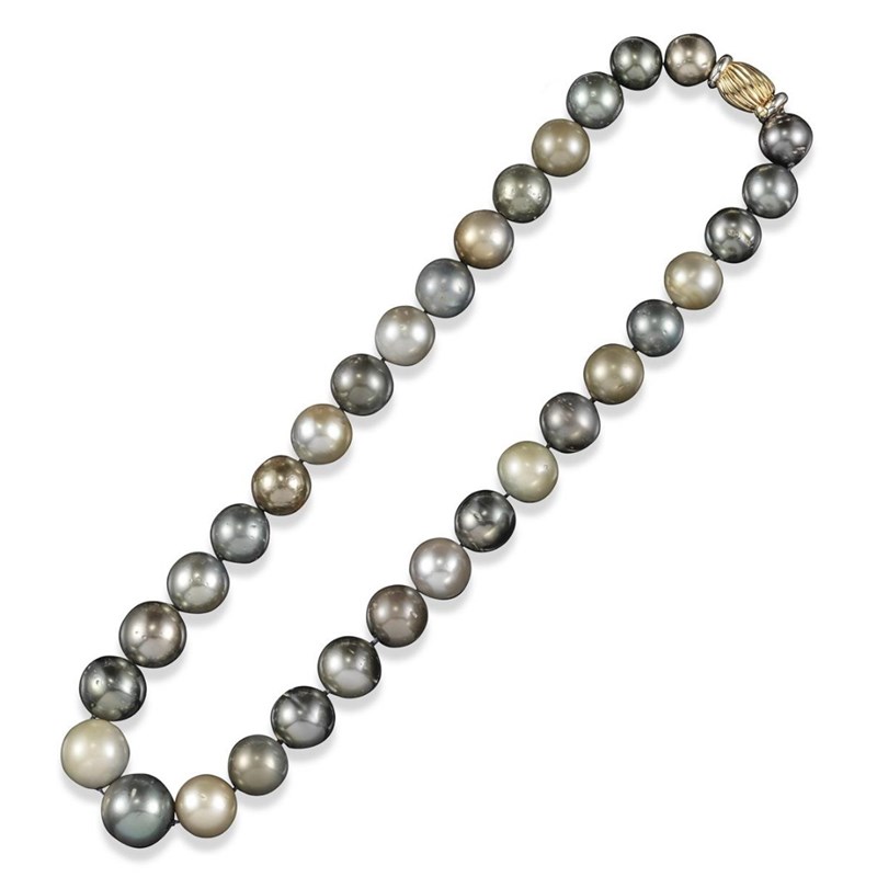A single-row cultured South Sea pearl necklace, the pearls of varying shades of grey graduate from 12.0 - 15.5mm. Yellow and white fluted gold barrel-shaped clasp. 47cm.