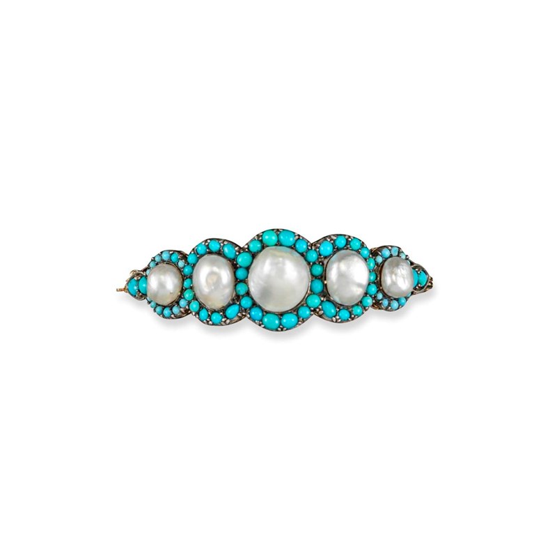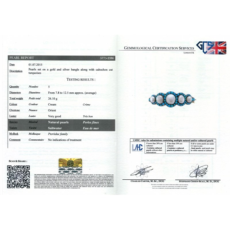 A Victorian pearl and turquoise mounted gold bangle, set with graduated pearls, each within a surround of turquoise cabochons in silver on gold.