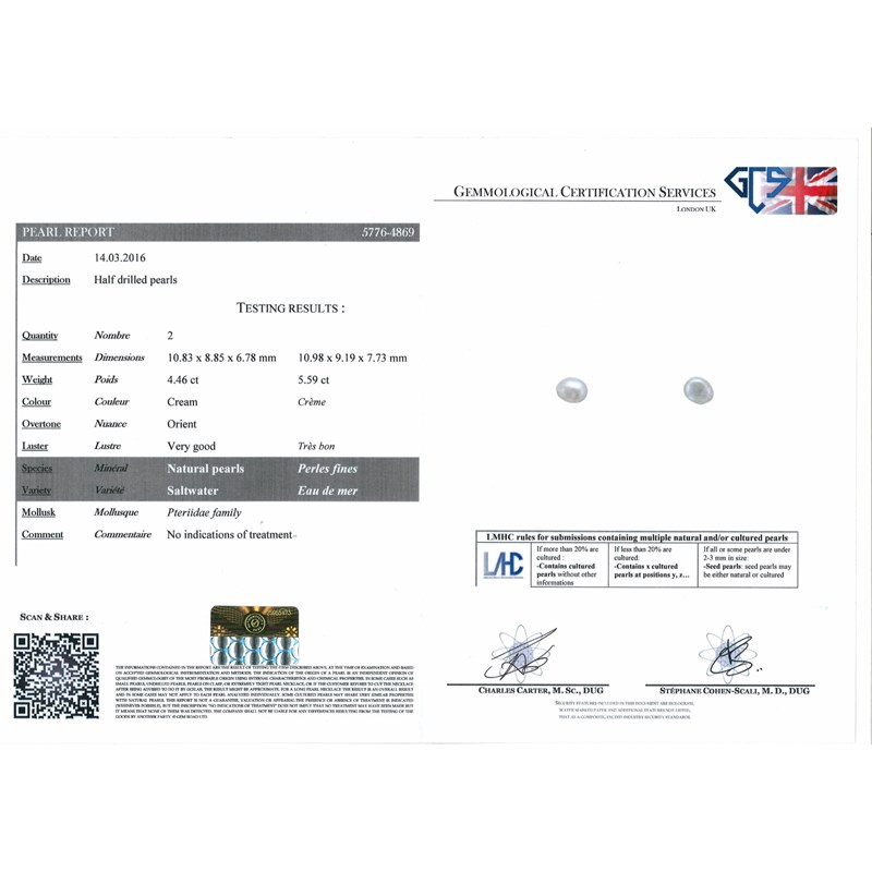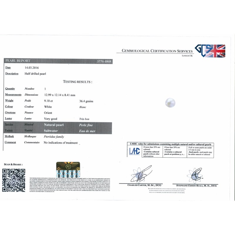 Accompanied by report number 5776-4868 dated 14th March 2016 from GCS, London stating that the white half-drilled central pearl weighs 9.10cts and is a natural saltwater pearl with no indications of treatment.