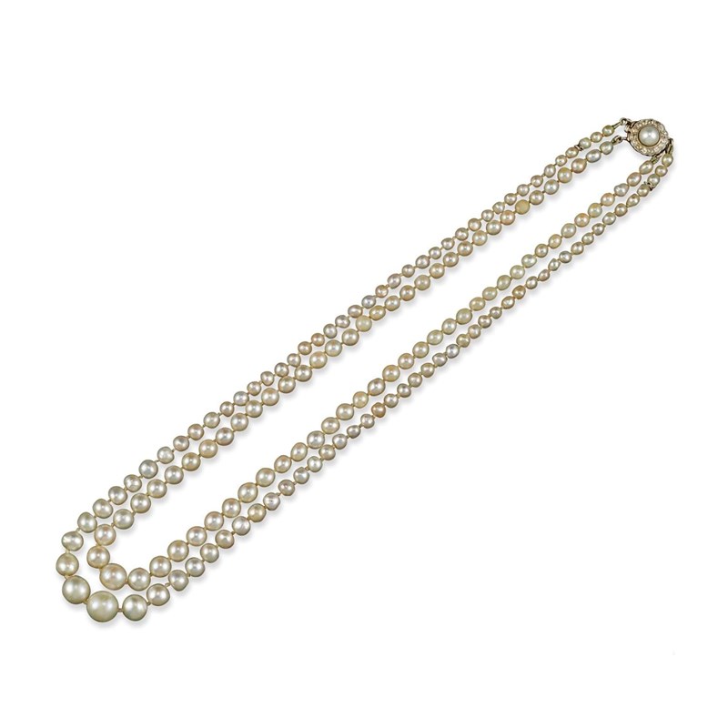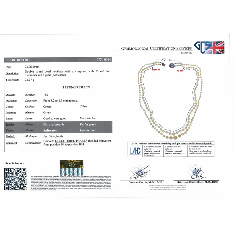 Accompanied by report number 5776-6044 dated 28th June 2016 from GCS, London stating that 93 of the 158 cream-coloured pearls are natural saltwater pearls which measure 3.2 - 8.7mm in diameter. The remaining 65 pearls are cultured pearls.