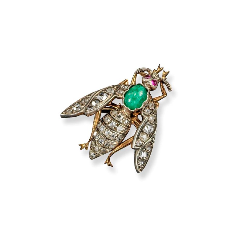 A Victorian diamond and gem-set insect brooch, the naturalistically formed insect with pavé-set diamonds overall and a cabochon emerald body, with ruby eyes, set in silver and gold. With detachable gold legs and brooch fitting.