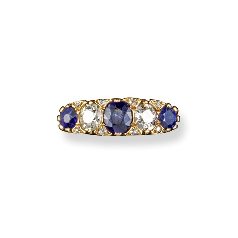 A sapphire and diamond five stone ring, alternately-set with oval-shaped sapphires and cushion-shaped diamonds within diamond pointers. In carved and pierced yellow gold mount. Size P.
