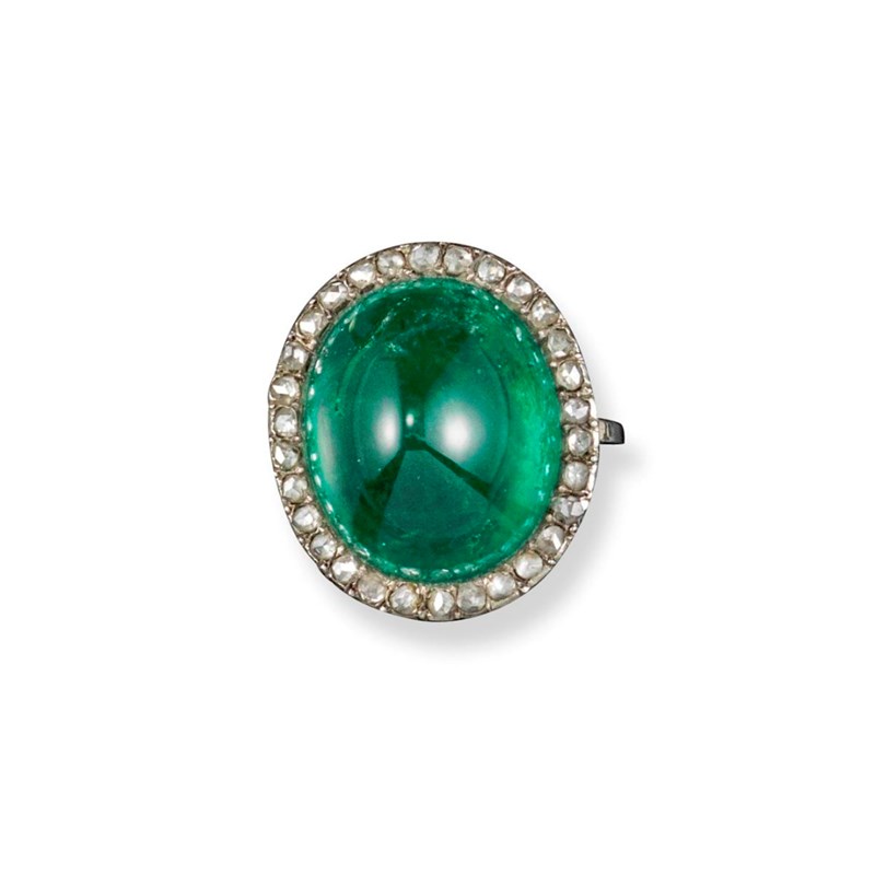 An impressive cabochon emerald and diamond cluster ring, the sugarloaf-shaped emerald weighs approximately 34.00cts and is set within a surround of rose-cut diamonds in platinum. Pierced mount. Size M.